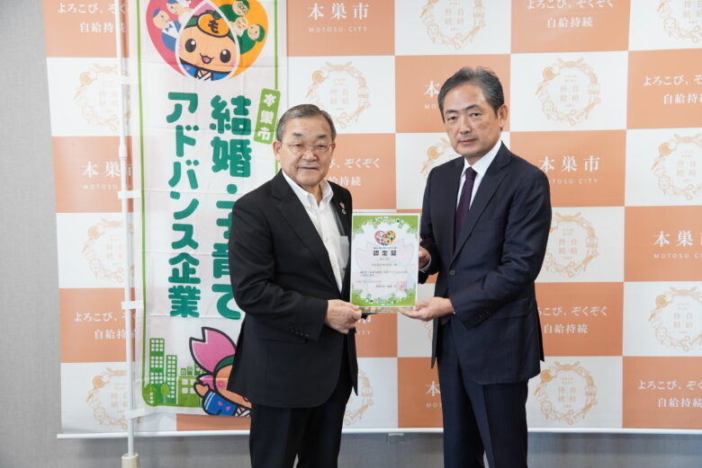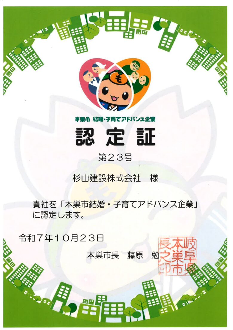 令和7年10月23日、本巣市が実施する「結婚・子育てアドバンス企業」に認定されました。